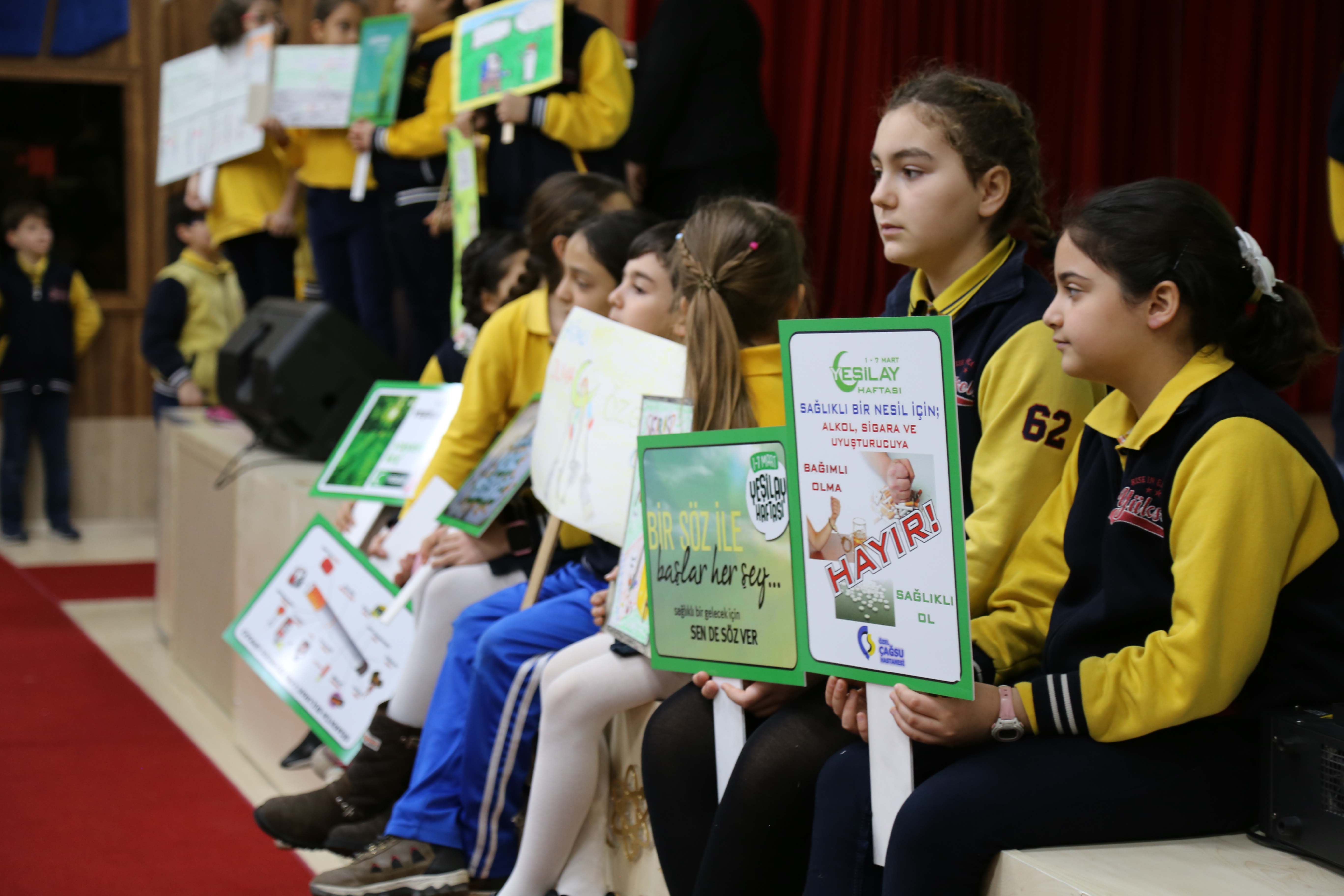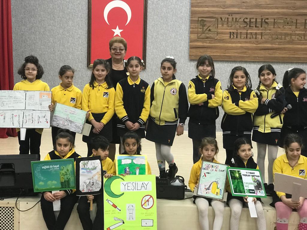 Yükseliş Koleji Bilim Kampüsü İlkokul öğrencilerimiz 1-7 Mart Yeşilay haftası etkinlikleri kapsamında konferans salonunda bir etkinlik düzenledi. Etkinlikte Yeşilay haftasının önemini anlatan pankartlar açan öğrencilerimiz sigara, alkol, kumar ve teknoloji bağımlılığına hayır dedi. Öğrencilerimize ve emeği geçen öğretmenlerimize teşekkür